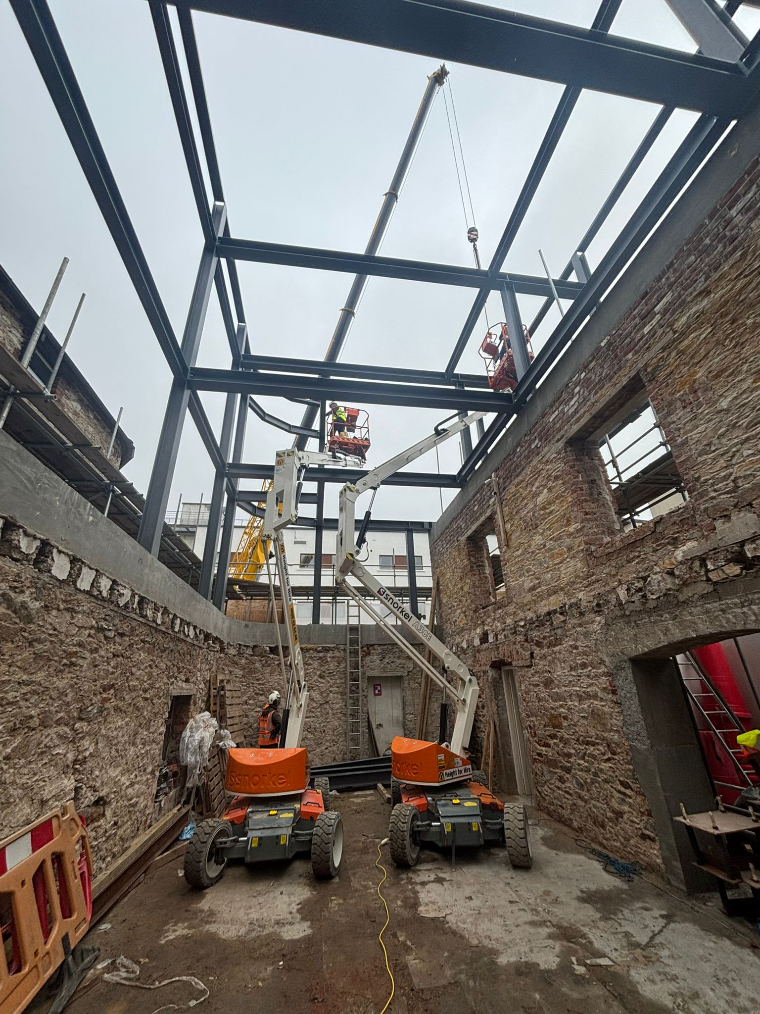Structural Challenges & Steel Solution: The challenge was to reinforce and extend the existing building without compromising its historic character. The stone and brick walls needed a solution that was lightweight, strong, and minimally disruptive.