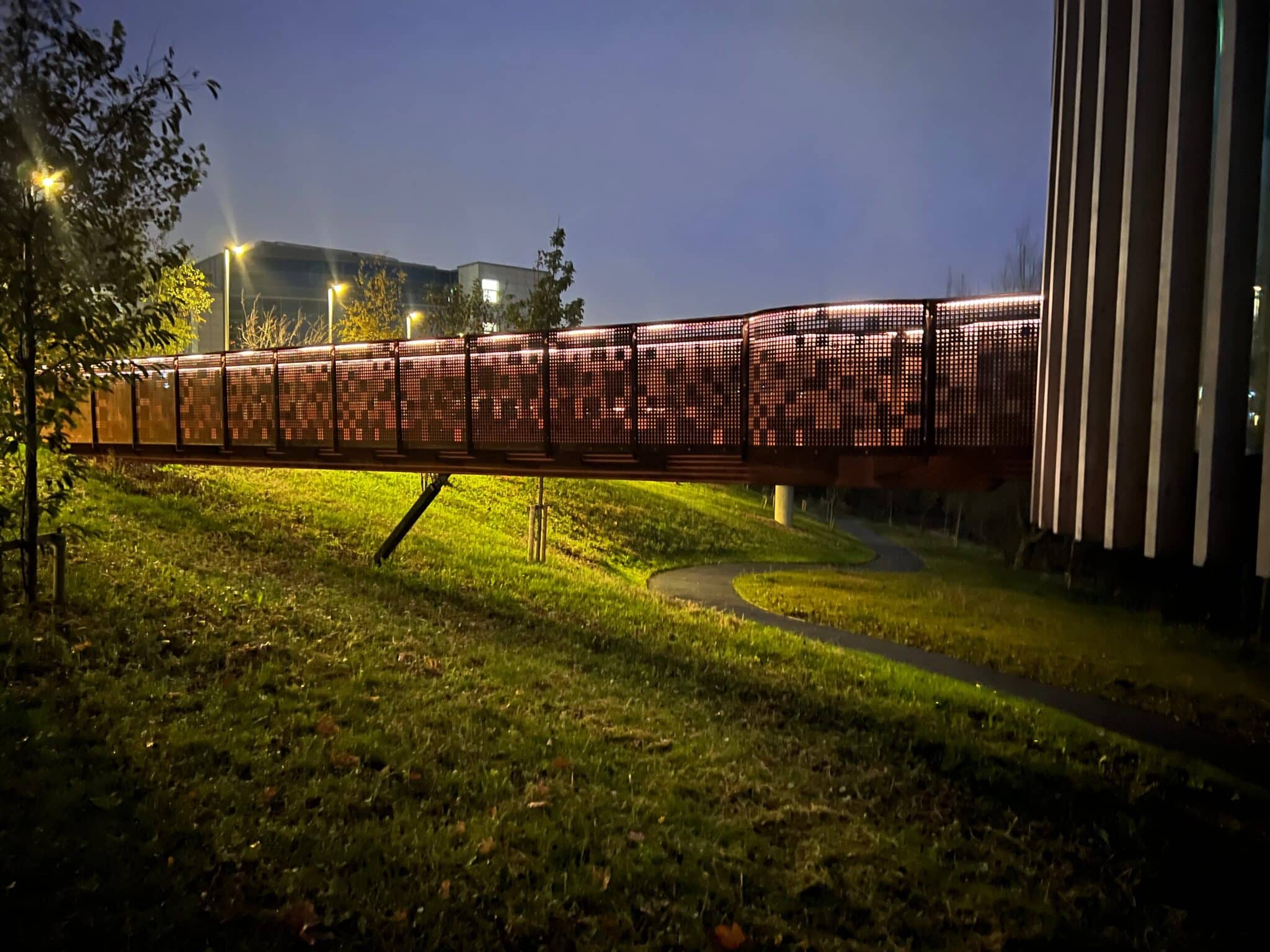 Working closely with architects, engineers, and contractors, Graepels was tasked with more than standard fabrication. The brief evolved into an ambitious modular bridge system, integrating biophilic principles, structural performance, and visual harmony. Natural materials like Cor-Ten were chosen for their ability to weather organically, blending with the trees rather than standing out with industrial finishes. From architectural cues, Graepels developed custom perforated balustrade panels—combining safety, light-permeability, and artistic form. Square perforations echoed dappled sunlight through leaves, enhancing airflow and visual integration.