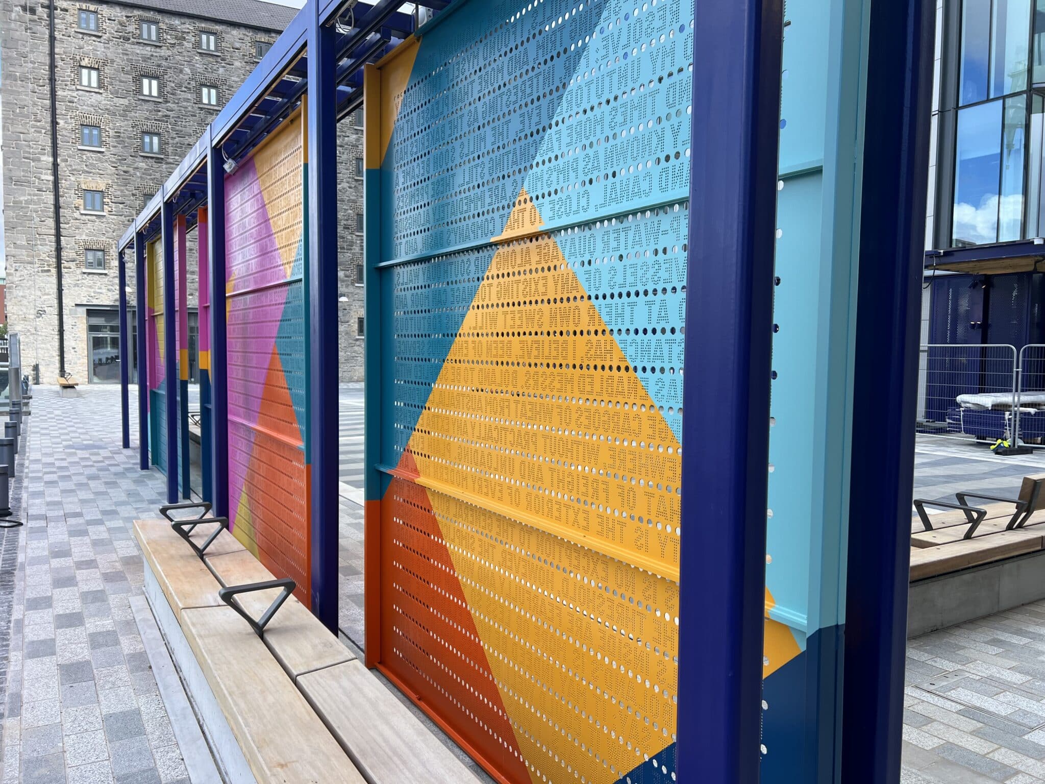 Beyond text, the installation was about light, shadow, materiality, and presence. Stainless steel was selected for its resilience to Dublin’s waterside climate; an environmentally friendly powder coat ensured lasting vibrancy while protecting the surface. The perforations themselves serve multiple functions: they cast dynamic shadows, allow natural light to filter through, offer transparency, and create visual interaction between observer and structure.
