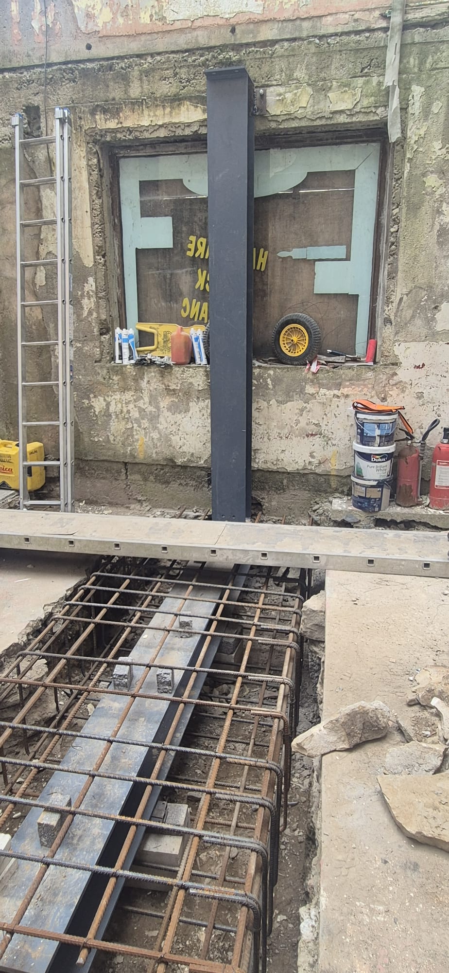 Internal walls were misaligned, cracked, and inconsistent in thickness and elevation. Standard framing methods were unsuitable, so bespoke layouts were developed for each bay, based on in-situ measurements. Walls were selectively chased or partially broken out, and baseplates sunk two feet below floor level, fixed in reinforced concrete footings tied with rebar cages.