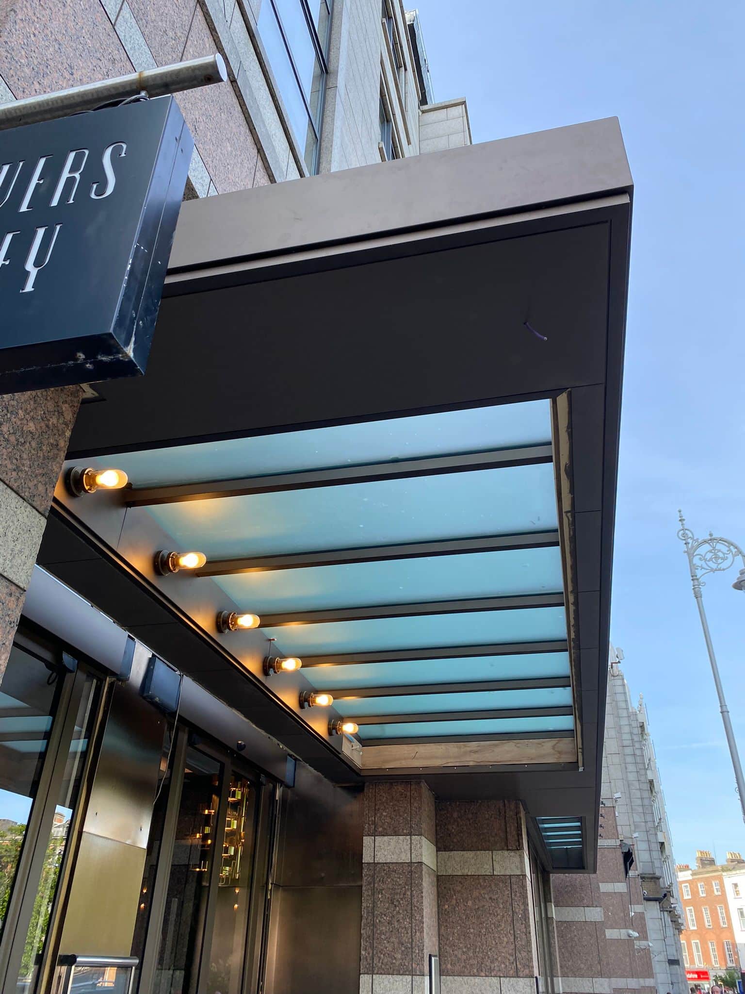 IDS was responsible for the design, fabrication, and installation of a bespoke Schüco Jansen ECO50 steel-framed pivot door system with clerestory fanlights and a Schüco Jansen VISS canopy above. Though minimalist in appearance, the installation required advanced structural calculations to handle wind loads, high public usage, and Dublin’s challenging climate.