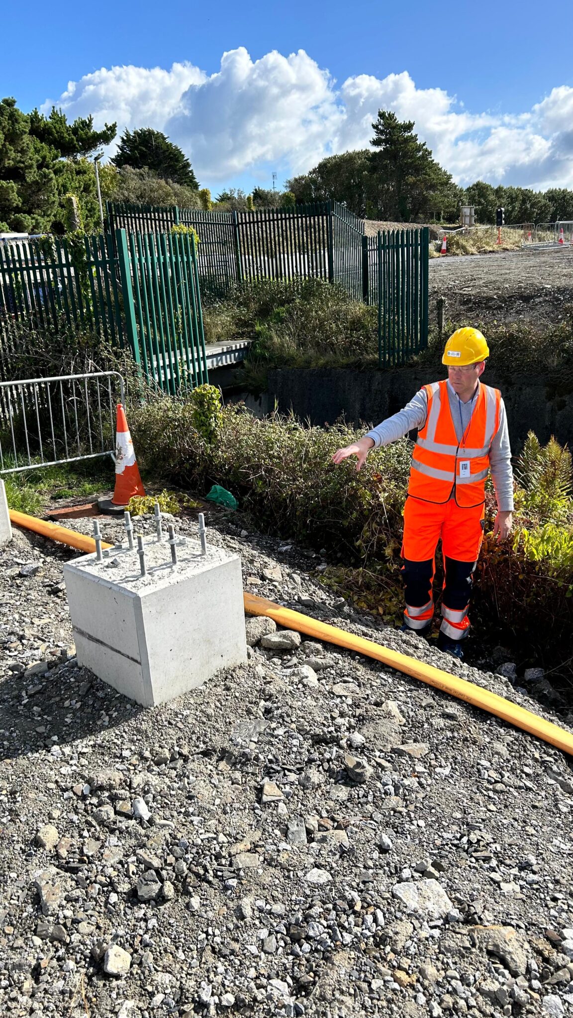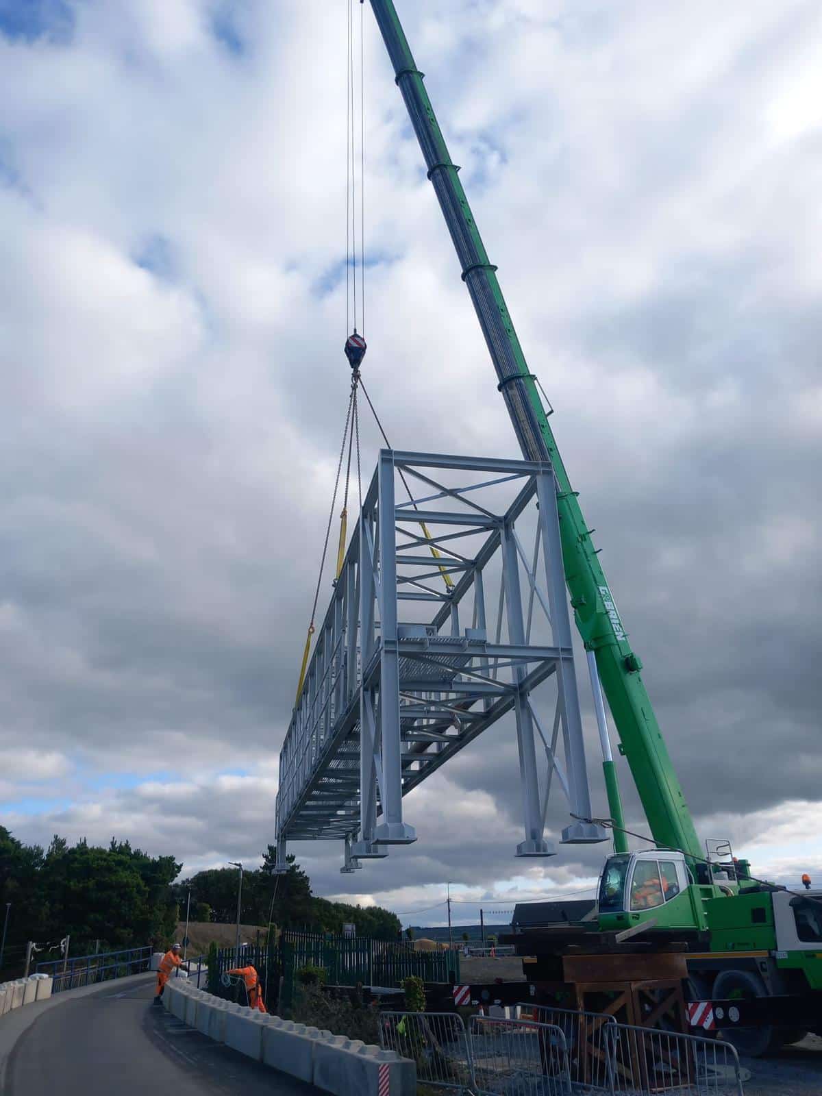At Tarbert, a road closure was coordinated to allow for safe unloading. The final vertical section was assembled on-site. A 200-ton crane from GOB Crane Hire lifted the bridge into position. The installation required spanning a 15-metre-wide sea water intake and working 10 metres above the River Shannon. KME teams positioned on both sides maintained clear communication throughout.