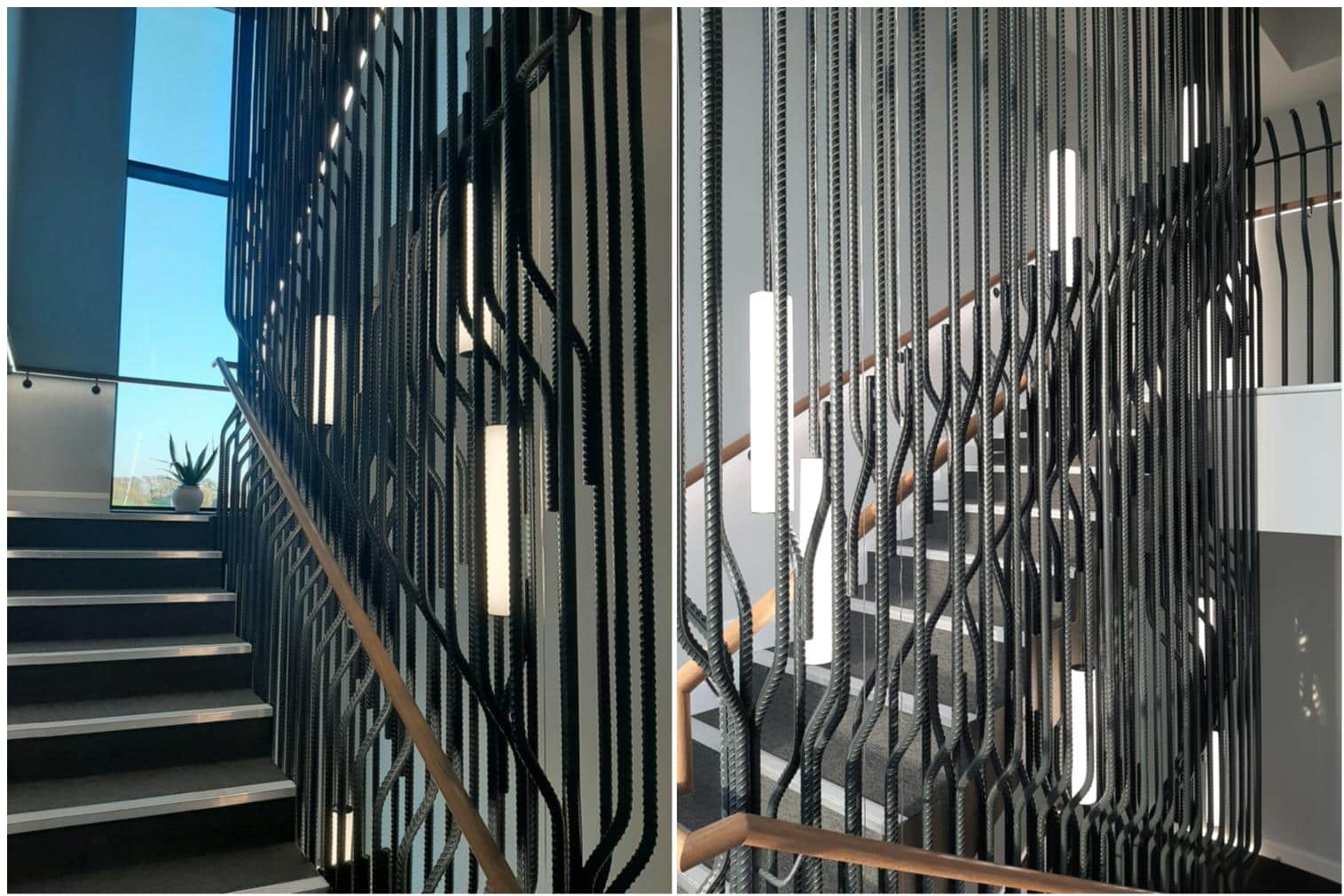 Inspired by the vertical rhythm and sculptural grandeur of a pipe organ, the staircase transforms traditional reinforcement into expressive architecture. Each vertical bar is intentionally left exposed, rising uninterrupted through the staircore in a dramatic, elegant formation. This challenges conventional thinking, reimagining reinforcement steel not as a hidden utility but as the primary design language.