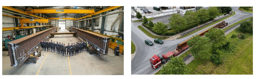 Murphy fabricated the bridge off-site at its Newbridge facility in Ireland using S355K2W weathering steel for corrosion resistance and long-term durability. A full digital model in Tekla Structures enabled real-time design approvals and efficient procurement. The bridge was constructed 500 metres from its final position and transported using 5-axle bogies.