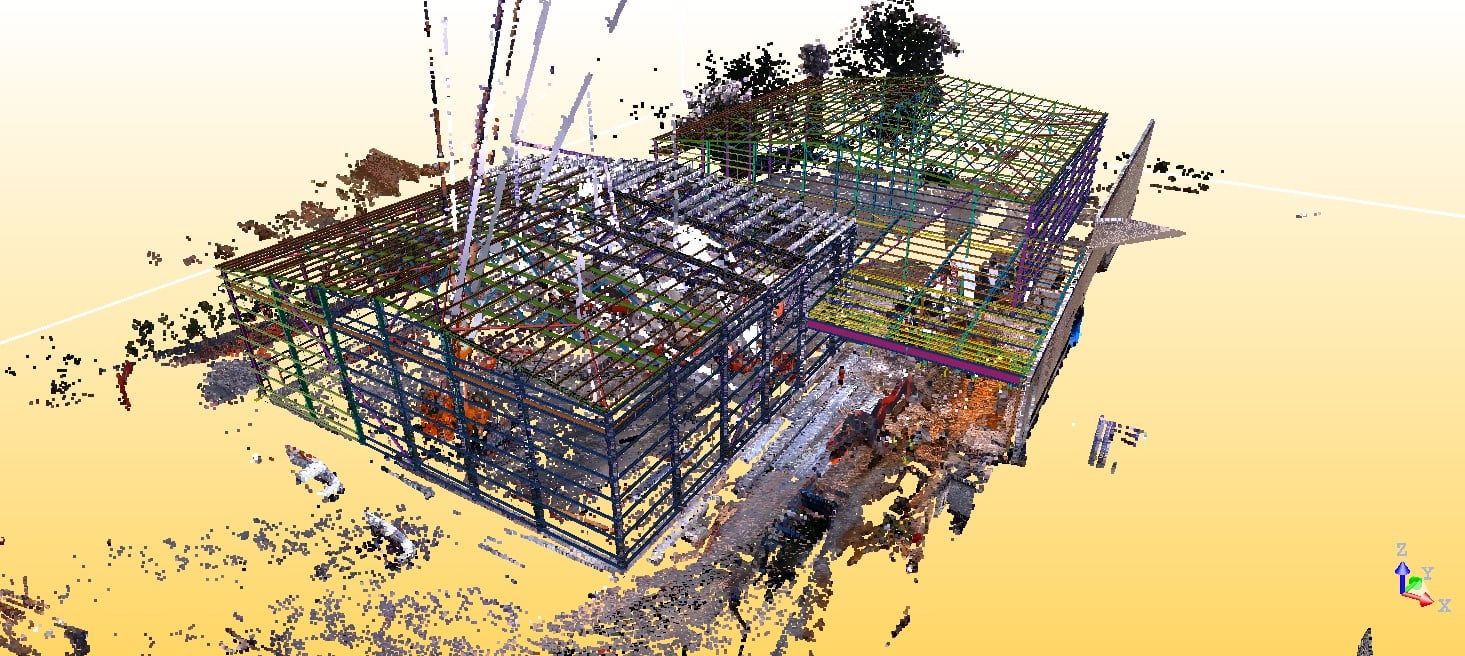 Using Tekla Structures, ODS produced a precise 3D model of the steelwork. This was integrated with Trimble X7 point cloud scans of the concrete bases and prior works, ensuring millimetre-perfect fit and reducing the need for on-site modification. All steel was fire-protected with intumescent paint to meet 60-minute resistance standards.
