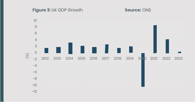The United Kingdom economy expanded by a meagre 0.1 per cent in 2023, followed a robust post-Covid growth rate of 4.3 per cent in 2022. This was the weakest annual growth since the 2009 financial crisis, excluding the pandemic-hit year of 2020. In the period from 2012 to 2023 real GDP growth averaged just 1.58 per cent, which represents a poor long-term growth performance. The UK economy went into technical recession in the second half of 2023, but emerged from recession in the first quarter of 2024, with GDP expanding by 0.7 per cent.