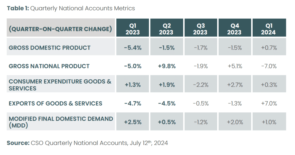 In understanding the Irish economy, very careful interpretation of economic data is necessary. Gross Domestic Product (GDP) is the normal metric used to measure economic activity, but in the case of Ireland, this measure is distorted by some of the activities of multi-national companies which are captured in GDP, but which do not reflect what is happening on the ground in the real economy. The CSO estimates that GDP expanded by 0.7 per cent in the first quarter of the year, suggesting that the technical GDP recession ended. GDP had contracted in all four quarters of 2023.